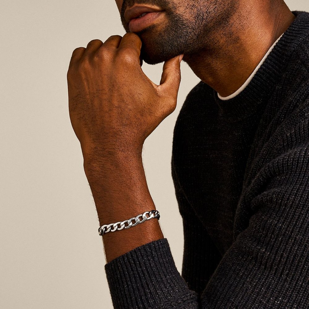 Combining men’s silver jewelry with clothing follows a few smart guidelines. First, balance is key: avoid wearing too many pieces at once. A single silver men’s necklace paired with a simple silver bracelet can make enough impact without feeling excessive. Consider the neckline of your shirt — a necklace works especially well with a V-neck. When wearing a button-down shirt, a bracelet can remain subtly visible when the sleeve is slightly rolled up. Choose materials that complement each other, such as denim with a bold silver chain bracelet or a crisp shirt with a refined necklace. A stylish tip is to match the tone of your metal accessories: if your watch is silver-toned, silver jewelry will pair seamlessly with it.